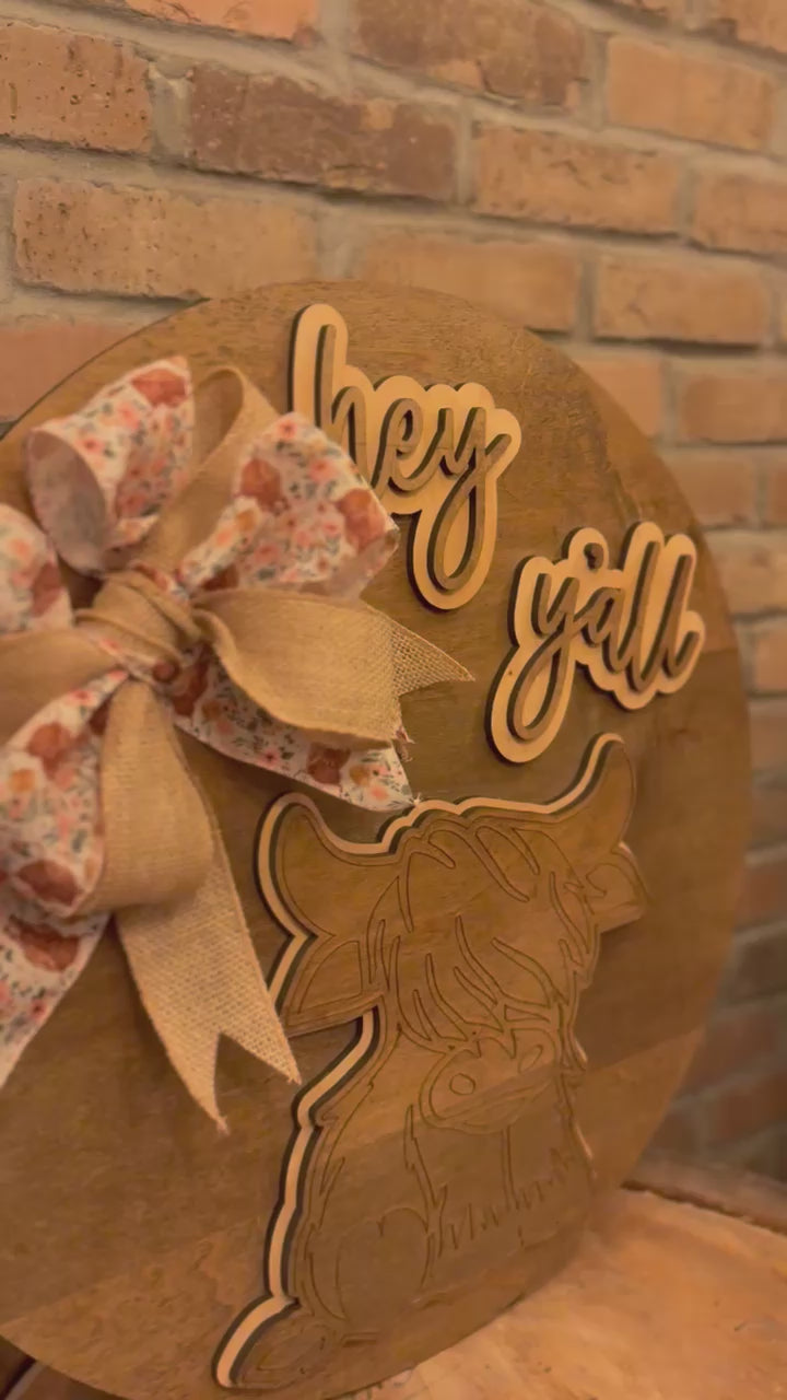 Bring charming farmhouse character to any space with this handcrafted Highland Cow round sign. Featuring intricate layered laser-cut details and a sweet bow accent, this rustic wall piece captures the gentle beauty of everyone's favorite fluffy cow.
